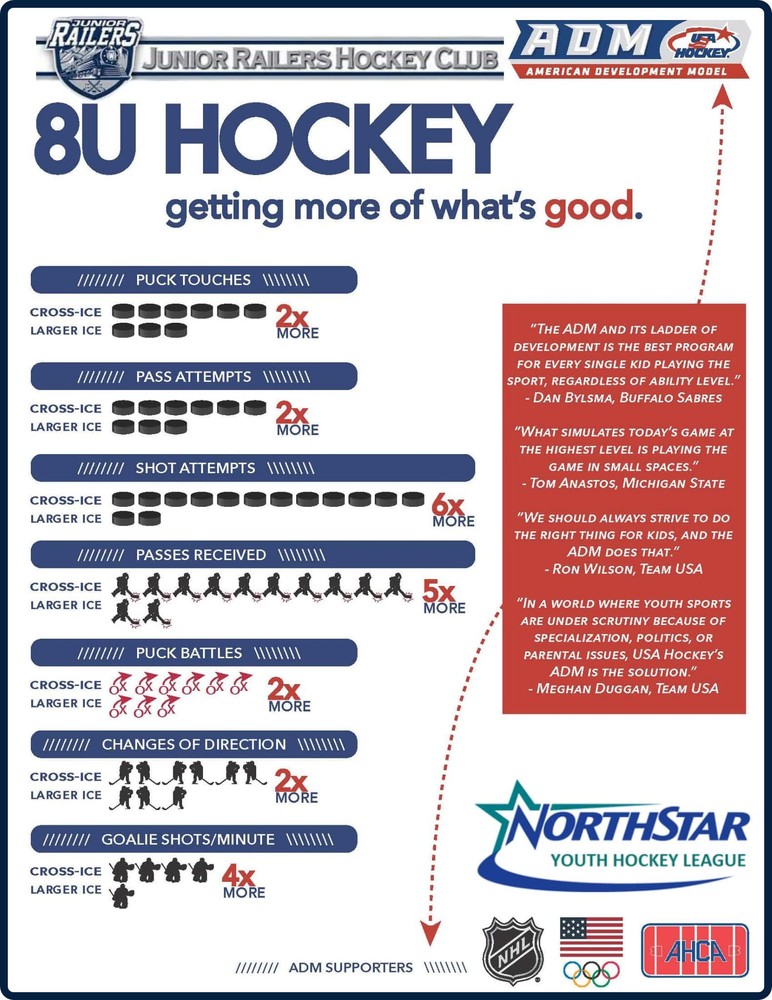 In addition to Learn to Play Hockey and The JRHC House League, the Junior Railers Hockey Club offers teams that compete in the Northstar Youth Hockey League (NSYHL), Valley Hockey League (VHL), Elite-9 Hockey League (E9), New England Girls Hockey League (NEGHL), and have 14U–18U National Bound teams — providing a clear development pathway and strong competition at every level.