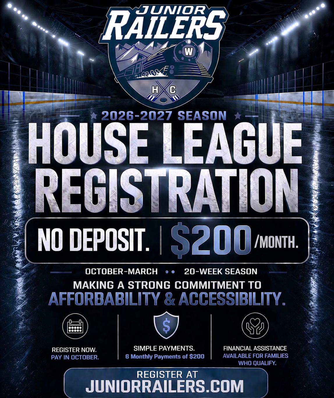 The 2026–2027 Junior Railers House League will feature a 20-week season with weekend practices and games from October to April, focused on development, fun, and a great team experience.
